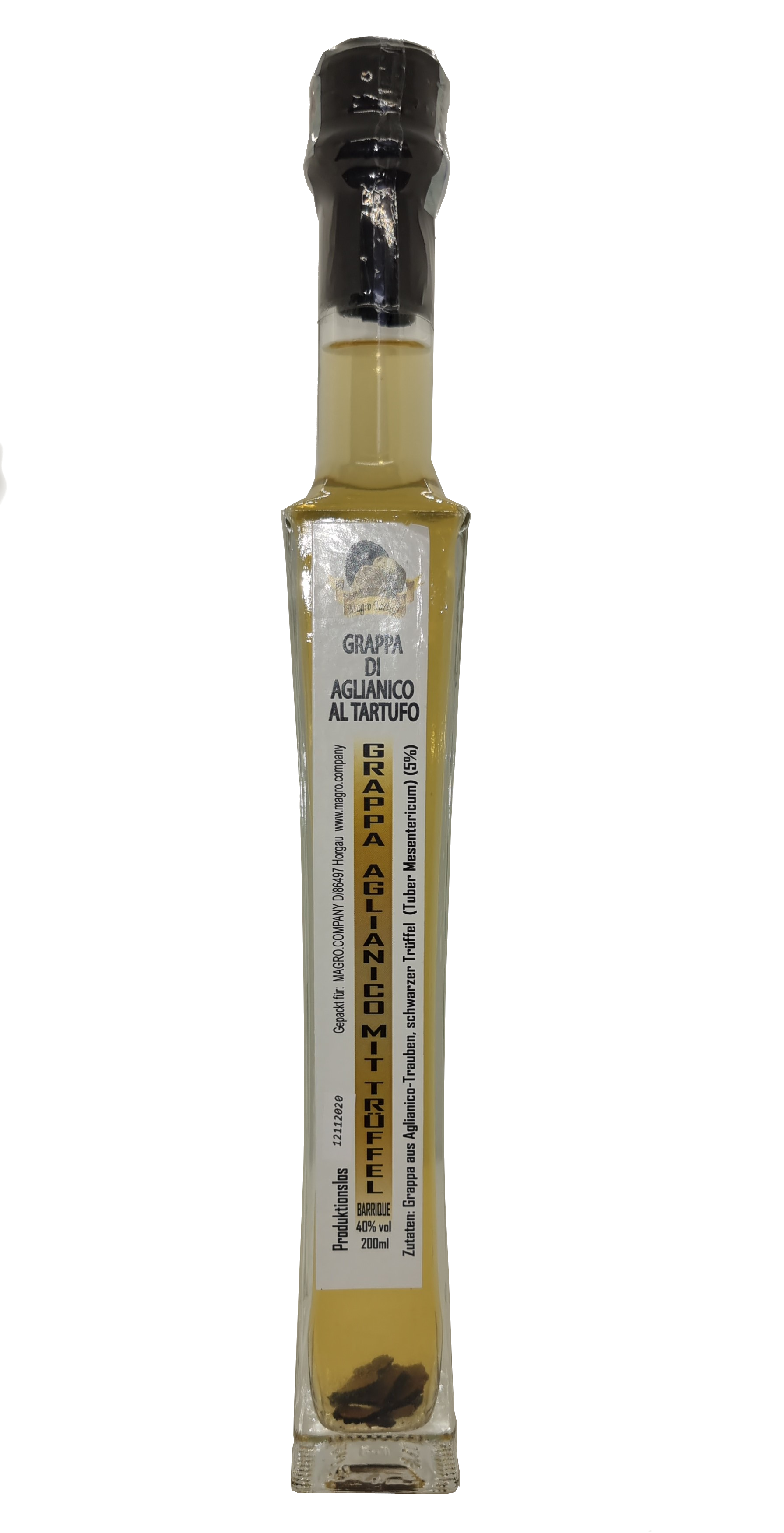 Grappa Aglianico (Bariqué ) mit Trüffel (Tuber Mesentericum) Ein edler Grappa, der aus 100% Aglianico Trauben fermentiert und gewonnen wird, anschließend wird er von Hand in kleinen Mengen im *diskontinuierlichen Destillation* verfahren bei niedriger Temperatur destilliert und 12 Monate in kleinen Eichenfässern gereift. Perfekt nach dem Essen! *( Beim diskontinuierlichen Destillationsverfahren wird der Trester nach jedem "Brand" aus dem Brennkessel entfernt und durch frischen Trester ersetzt. Die Destillation muss daher zwischen den einzelnen Arbeitsgängen gestoppt werden, um Trester zu entfernen bzw. neu einzufüllen).